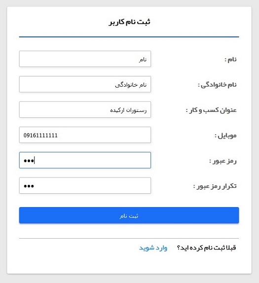 1. به صفحه عضویت بروید و مطابق عکس زیر فرم شماره 1 را تکمیل کنید و دکمه ارسال را بزنید.