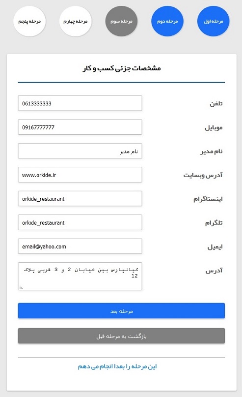 3. مرحله سوم شامل مشخصاتی مثل آدرس شعبات، تلفن ، موبایل ، آدرس تلگرام و اینستاگرام کسب و کار شماست. فرم را پر کنید و به مرحله بعد بروید.