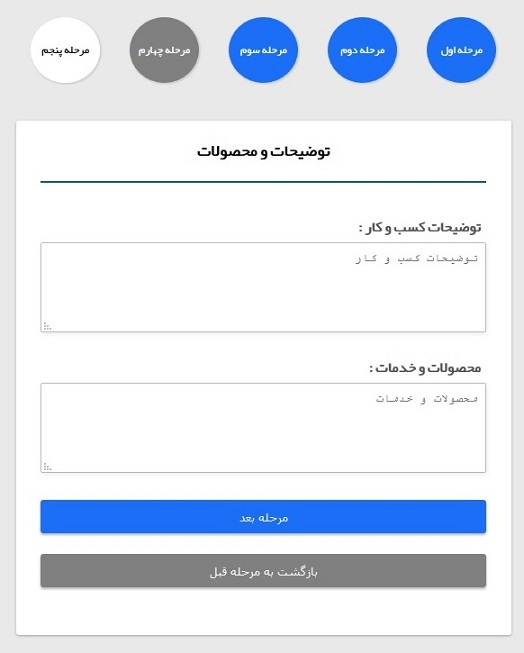 4. در این مرحله توضیحات و محصولات و خدماتی که ارائه می دهید را به طور کامل بنویسید . هر چقدر که اطلاعات این قسمت تکمیل تر و دقیق تر باشد قطعا رتبه بهتری در سایت و موتور های جستجو خواهید داشت.