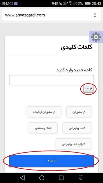 8. حال قسمت "کلمات کلیدی" را تکمیل کنید . این بخش برای موتور های جستجو و افزایش بازدید صفحه اختصاصی کسب و کار شما بسیار اهمیت دارد و اگر می خواهید صفحه شما در اولین گزینه های نمایش در گوگل را داشته باشد باید با دقت و هوشمندی کلمات کلیدی خود را انتخاب کنید. برای ورود به این قسمت بر روی دکمه چرخدنده کلیک کنید و "کلمات کلیدی" را انتخاب کنید. حال هر کلمه ای که می خواهید اضافه کنید را در کادر بنویسید و دکمه افزودن را بزنید. حتما یادتان باشد که پس از افزودن تمام کلمه های دلخواه خود دکمه ذخیره را بزنید، در غیر این صورت اطلاعات ذخیره نخواهند شد.